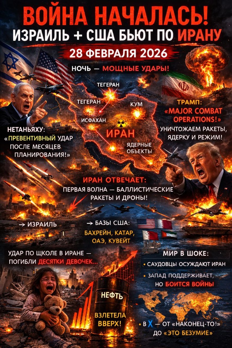 28 февраля 2026 Ночь: мощные удары по Тегерану, Исфахану, Куму, ядерным и военным объектам. Трамп — уничтожаем ракеты, ядерку и режим! Нетаньяху: «Превентивный удар после месяцев планирования» Иран отвечает: 🚀 Первая волна баллистических ракет и дронов → по Израилю → по базам США в Бахрейне, Катаре, ОАЭ, Кувейте Взрывы по всему заливу, ПВО Израиля на пределе Удар по школе в Иране — погибло 40 девочек. Нефть взлетела вверх Мир в шоке: Саудовцы осуждают Иран Запад поддерживает, но боится большой войны В X — от «наконец-то!» до «это безумие» Регион на грани полномасштабной войны. #Израиль #Иран #США #Война #БлижнийВосток 🔔 Подпишись | 👍 Поставь реакцию | ♻️ Репост