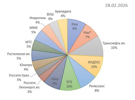 Обзор портфеля - февраль 2026 Текущую структуру портфеля привожу на диаграмме, комментарии ниже. 💵 Кэша 17% (кэш со звездочкой - это короткие облигации, которые можно конвертировать в кэш). 🟢 Немного докупил МТС ($MTSS) по 221. Отчетность 5 марта, надо будет посмотреть на динамику роста выручки и процентных расходов, возможно будут какие-то намеки на дивиденды. 🟢 Ленэнерго ап ($LSNGP) и Россети Урал ($MRKU) без изменений, планирую нарастить до 5% каждую. Ожидаемая дивдоходность за 2025 год - около 11.1%, за 2026 - около 15%. 🟡 Транснефть ($TRNFP) - на данный момент уже достигла справедливой цены, некоторые каналы публично закрыли идею. Я пока хочу подержать, как минимум до отчетности (чтобы рассчитать дивиденд), а может быть и до его объявления - на тот момент ставка будет ниже, а справедливая цена соответственно - выше. Ключевой вопрос - что будет в России с добычей нефти в 2026, нужно следить за прогнозами, пока аналитики роста не ждут. Одновременно снизятся процентные доход