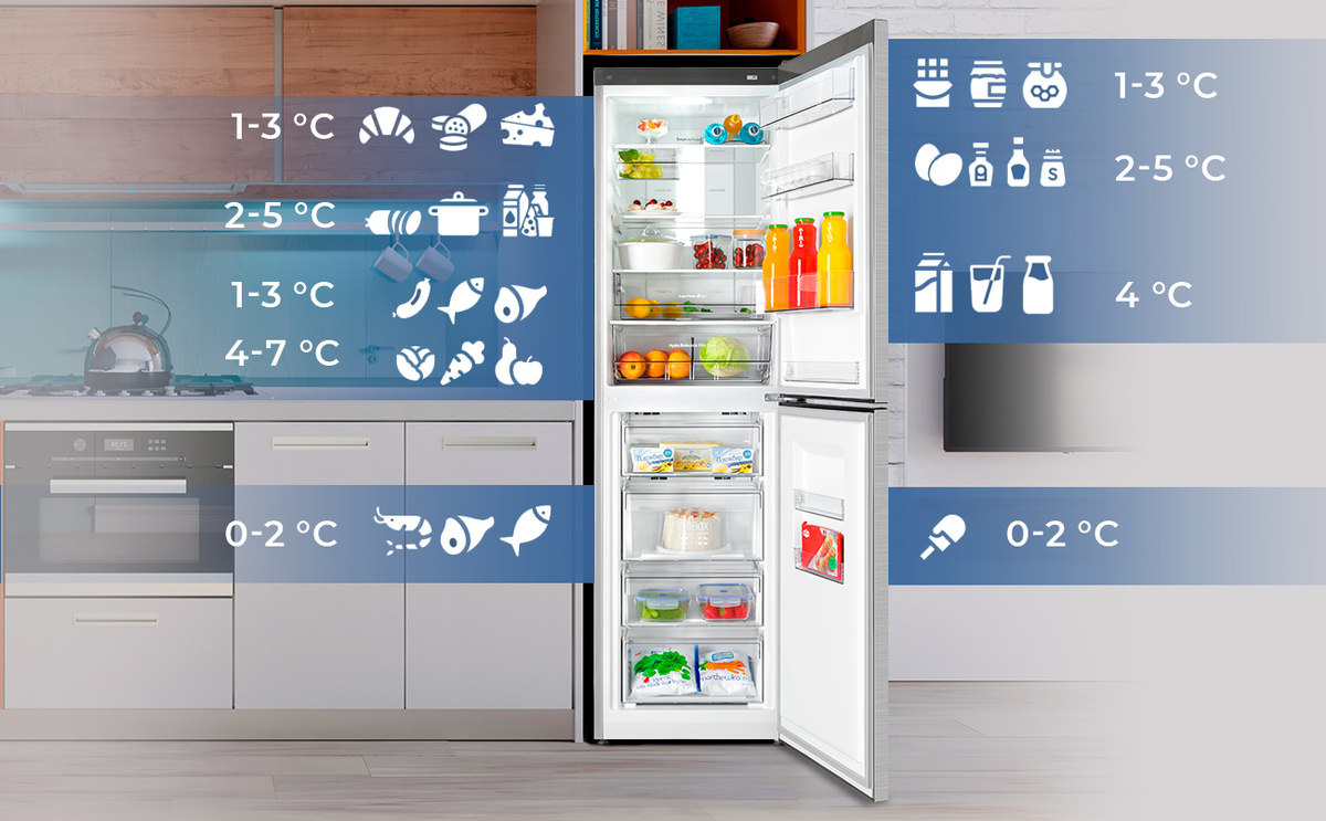 - Зона холода (у задней стенки, нижние полки): +0°C ... +1°C. Это место для самого скоропортящегося: свежее мясо, рыба, молочка, открытые соусы в банках (кроме тех, что требуют только комнатной температуры).
