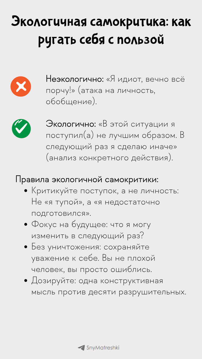 Полностью отказаться от самокритики невозможно, да и не нужно. Важно, чтобы критика работала на вас, а не против вас. Экологичная самокритика — про рост, экологичная — про разрушение. Цель самокритики — не втоптать себя в грязь, а подсветить зону роста. Относитесь к себе как к тренеру, который верит в вас, но указывает на ошибки. Поддержать автора Александра Бóгдан,