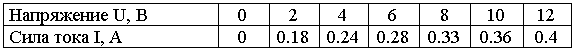 Я подал на лампочку напряжение(U =0; =2; =4; =6; =8; =10; =12) и измерил силу тока (I =0,18; =0,24; =0,28; =0,33; =0,36; =0,4).