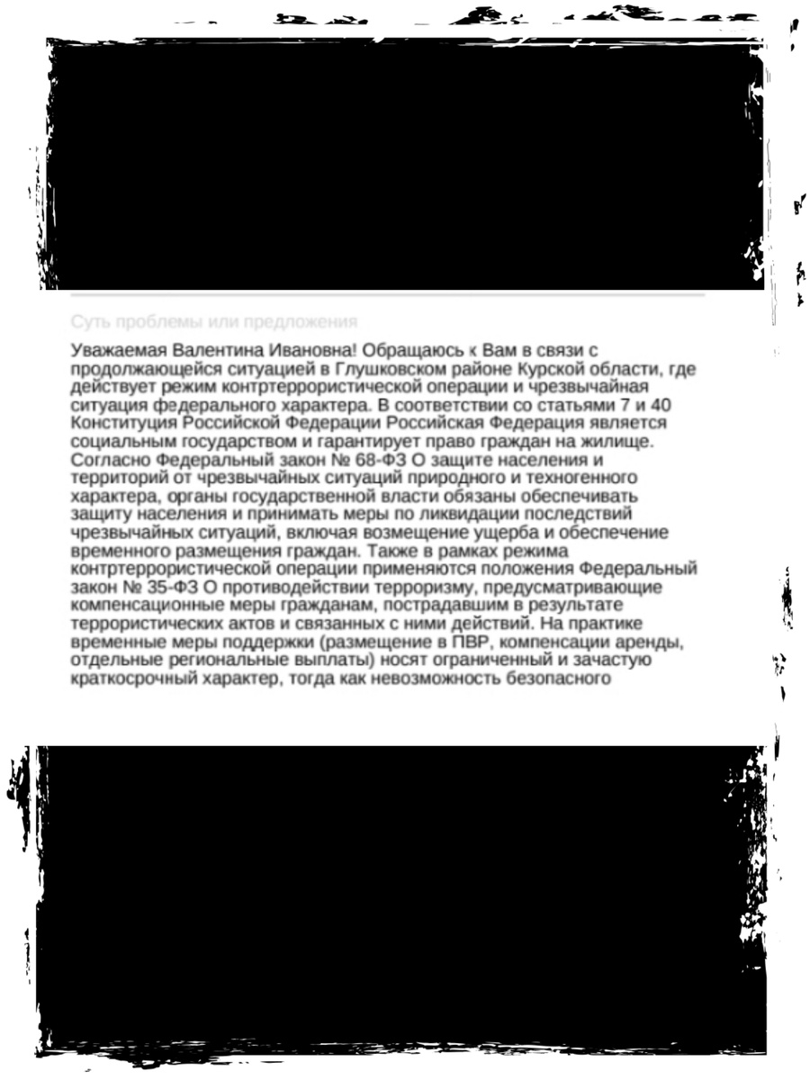 Граждане Глушковского района Курской области, проживающие в условиях постоянной опасности и вынужденной эвакуации, обращаются с требованием немедленно принять меры по восстановлению их жилищных прав. Несмотря на введённые режимы чрезвычайной ситуации федерального характера и контртеррористической операции, жители продолжают сталкиваться с отсутствием нормального жилья и неопределённостью своего будущего.