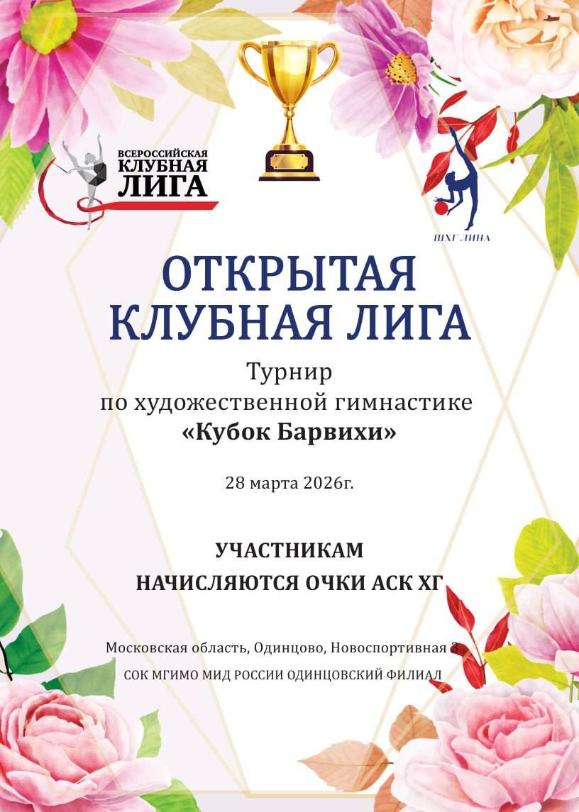 »✨🌸 Дата проведения: 28 марта 2026 года Место: СОК МГИМО МИД России, г. Одинцово, ул. Ново-Спортивная, д. 3 🏆Что ожидает участниц: — начисление рейтинговых очков Клубной Лиги; — выступления индивидуальных гимнасток и групповых команд; — яркая соревновательная атмосфера и обмен опытом. ⭐️Не пропустите турнир и поддержите спортсменок! 🔗Подробности и положение – на сайте: https://rgclubsleague.com/schedule/otkrytaya-klubnaya-liga-turnir-po-khudozhestvennoy-gimnastike-quot-kubok-ba280_74306/?clear_cache=Y