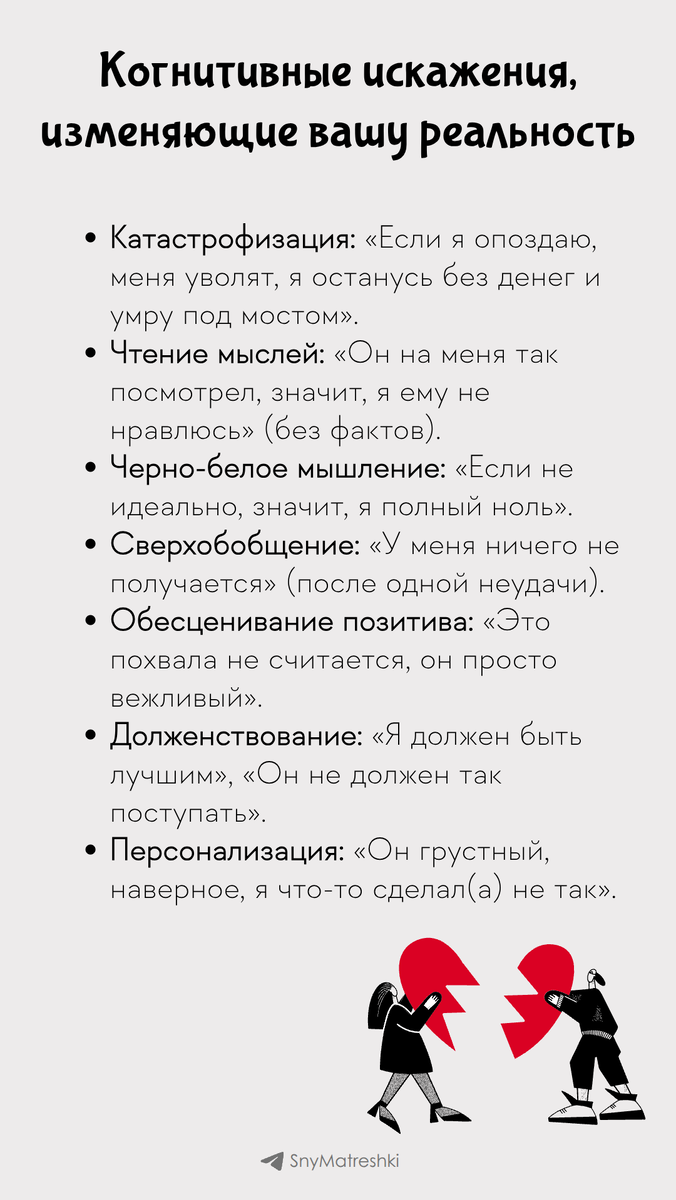 Наш мозг использует ментальные «короткие пути», которые часто заводят нас в ловушки негативного мышления. Распознавание этих искажений — ключ к более здоровому восприятию. Когда вы ловите себя на сильной негативной эмоции, спросите: «Какое когнитивное искажение сейчас работает?». Оспорьте его фактами. Поддержать автора Александра Бóгдан,