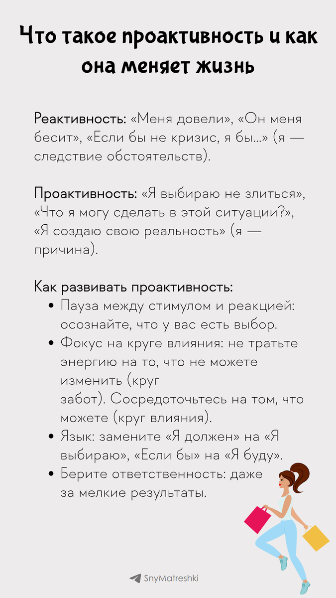 Проактивность — это способность выбирать свою реакцию на события, а не быть жертвой обстоятельств. Это главный навык зрелой личности. Проактивность — это свобода. Переставая быть жертвой, вы становитесь автором своей жизни. Поддержать автора Александра Бóгдан,