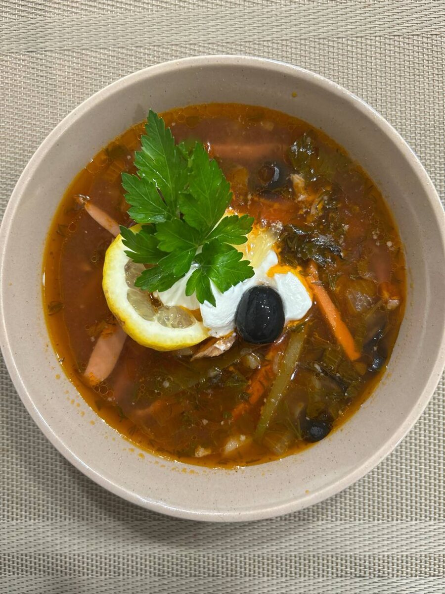 Знаете ли вы, что солянка (изначально «селянка») — блюдо с богатой историей? Когда‑то его готовиликрестьяне из того, что было под рукой: квашенойкапусты, огурцов и мясных обрезков. Со временемпростая похлёбка превратилась в кулинарнуюклассику — сначала украшала столы трактиров, апозже вошла в меню ресторанов. Сегодня солянка — это густой, ароматный суп снасыщенным кисло‑солёным вкусом. В нёмгармонично сочетаются: крепкий мясной бульон; ассорти из мяса и колбас; солёные огурцы и рассол; маслины и каперсы; лимон и свежая зелень. Пробуем 🙃 Видео-рецепт уже совсем скоро на моем канале https://youtube.com/@juli_ya_povar Присоединяйтесь!!!! Всем приятного аппетита 😋