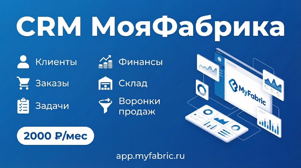 Устали от хаоса в Excel и потерянных заказов? Переходите на CRM, которая реально работает! Что внутри: • Клиентская база с юр. лицами и историей взаимодействий • Заказы: Канбан, Гантт, календарь дедлайнов • Воронки продаж с автоматизацией и аналитикой • Задачи для команды с напоминаниями • Финансы: учёт платежей, интеграция с Точка Банк • Склад и инвентаризация • Договоры по шаблонам • Email-рассылки и автопостинг в ВК/Telegram/Instagram • Интеграция с маркетплейсами Для производств: учёт 3D-принтеров, материалов, себестоимости ✅ Всего 2000 ₽/мес — без скрытых платежей 🎁 14 дней бесплатный тестовый период Попробуйте: https://app.myfabric.ru