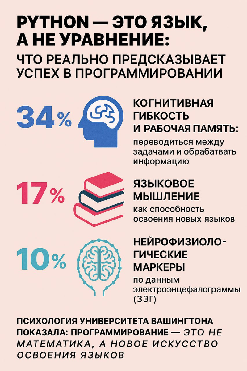 Ученые из Университета Вашингтона проверили, какие способности помогают быстрее и успешнее освоить Python. Спойлер: не математика, а языковое мышление. ▪️36 взрослых без опыта программирования ▪️10 сессий обучения Python через Codecademy ▪️До старта - когнитивные тесты и 5 минут ЭЭГ в состоянии покоя ▪️После - тест на знания и задание: написать игру «Камень-ножницы-бумага» на Python 🔹Когнитивная гибкость и рабочая память - объясняют 34% различий в результатах. Это способность удерживать и обрабатывать информацию, переключаться между задачами. 🔹Языковое мышление - 17%. Измерялось с помощью MLAT (Modern Language Aptitude Test), который оценивает способность к освоению новых языков: грамматические шаблоны, фонетическая память, логика языка. 🔹Нейрофизиологические маркеры - 10%. По данным ЭЭГ (электроэнцефалограммы) в состоянии покоя: уровень синхронности и активности в определенных участках мозга. 🔹Математическая грамотность - всего 2%. Почти не влияет на качество кода или понимание си