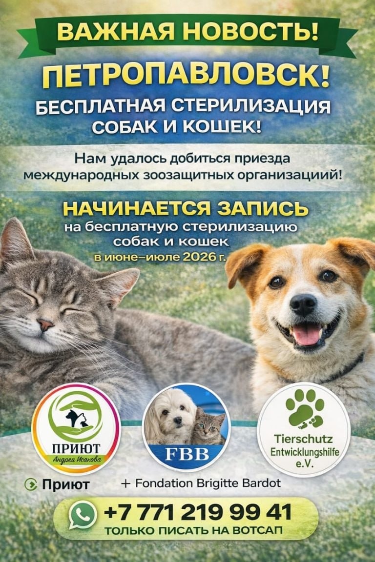 В Петропавловск приедет международная команда ветеринарных специалистов для проведения бесплатной стерилизации собак и кошек, рассказывает Петропавловск.news. Мероприятие, которое проведут в приюте Андрея Исакова, организовано при поддержке Фонда Бриджитт Бардо и международной зоозащитной организации Tierschutz Entwicklungshilfe e.V. — Это фонды с многолетним опытом реальной, эффективной помощи животным по всему миру, а также с привлечением волонтеров из разных стран. Это большой и важный шаг для нашего города. Мы сможем гуманно, цивилизованно, эффективно решить проблему города, — рассказали в приюте Исакова. Сейчас сотрудники приюта начинают принимать заявки на бесплатную стерилизацию собак и кошек. Процедуры будут проводить на базе летом 2026 года. Также к участию приглашают: ⦁ волонтёров, ⦁ кураторов безнадзорных животных, ⦁ владельцев животных, ⦁ базы, где содержат животных. Вы сможете записать подопечных на бесплатные процедуры и принять участие в организации мероприятия. Так