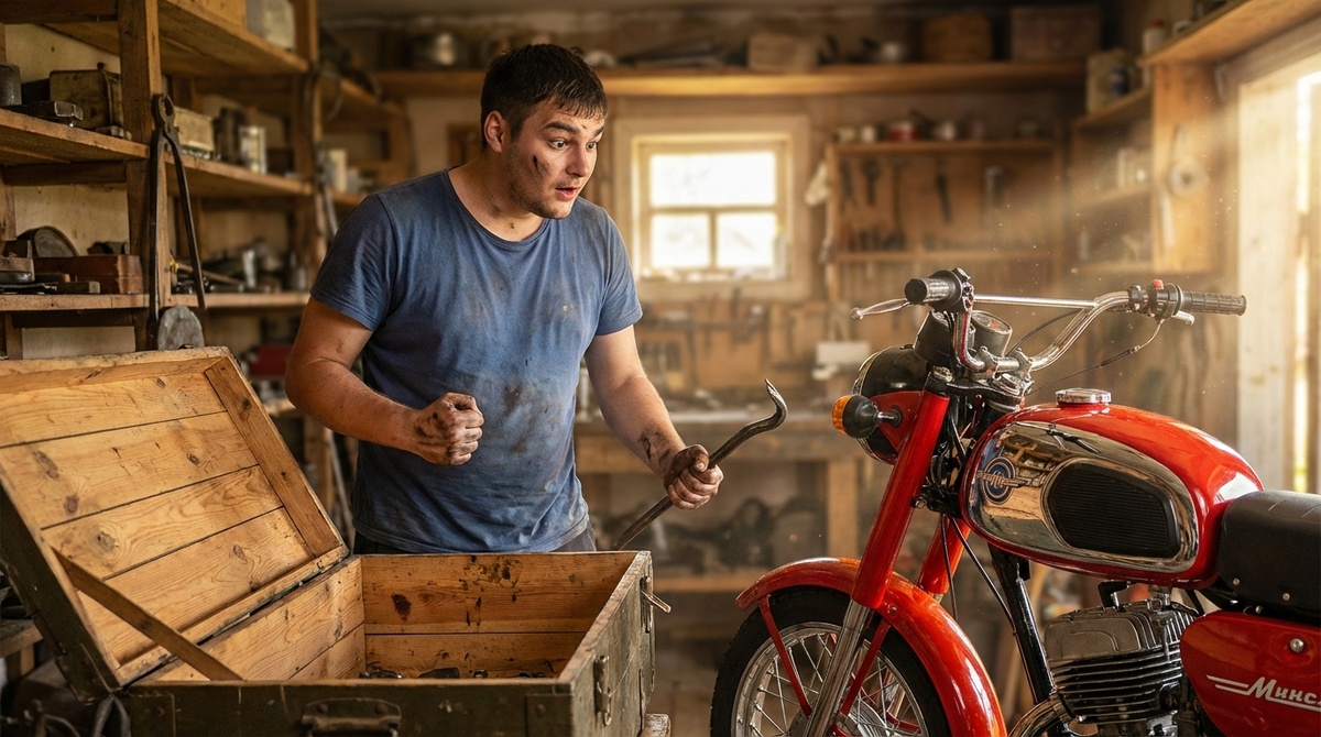 Под слоем столетней пыли, в заводской смазке, которую даже время не взяло, стоял он. «Минск» ММВЗ-3.112. Легендарная «Макака», как мы её в детстве называли. Но не просто мотоцикл, а «капсула времени». В коробке. Без пробега. Совсем.