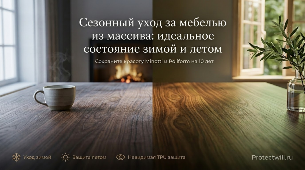 Уход за мебелью зимой и летом больше не означает беготню с увлажнителем воздуха и банками воска. Это означает один раз установить технологичную защиту и забыть о проблемах на 7-10 лет.