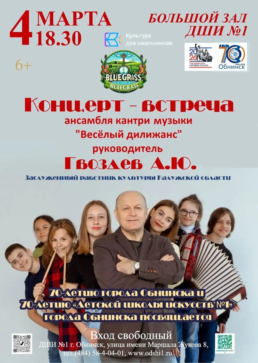 », руководитель заслуженный работник культуры Калужской области Алексей Юрьевич Гвоздев. Этот концерт — часть большого празднования: 70-летия школы и города Обнинска. Вход свободный. Обнинск, ул. Маршала Жукова, 8. 👍 Подписаться | Ваша реклама