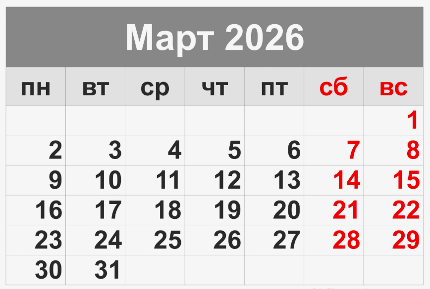 Для взрослых в первый весенний месяц, к сожалению, дополнительных выходных в честь 8 Марта не предусмотрено: праздник в 2026 году выпадает на воскресенье и не переносится.