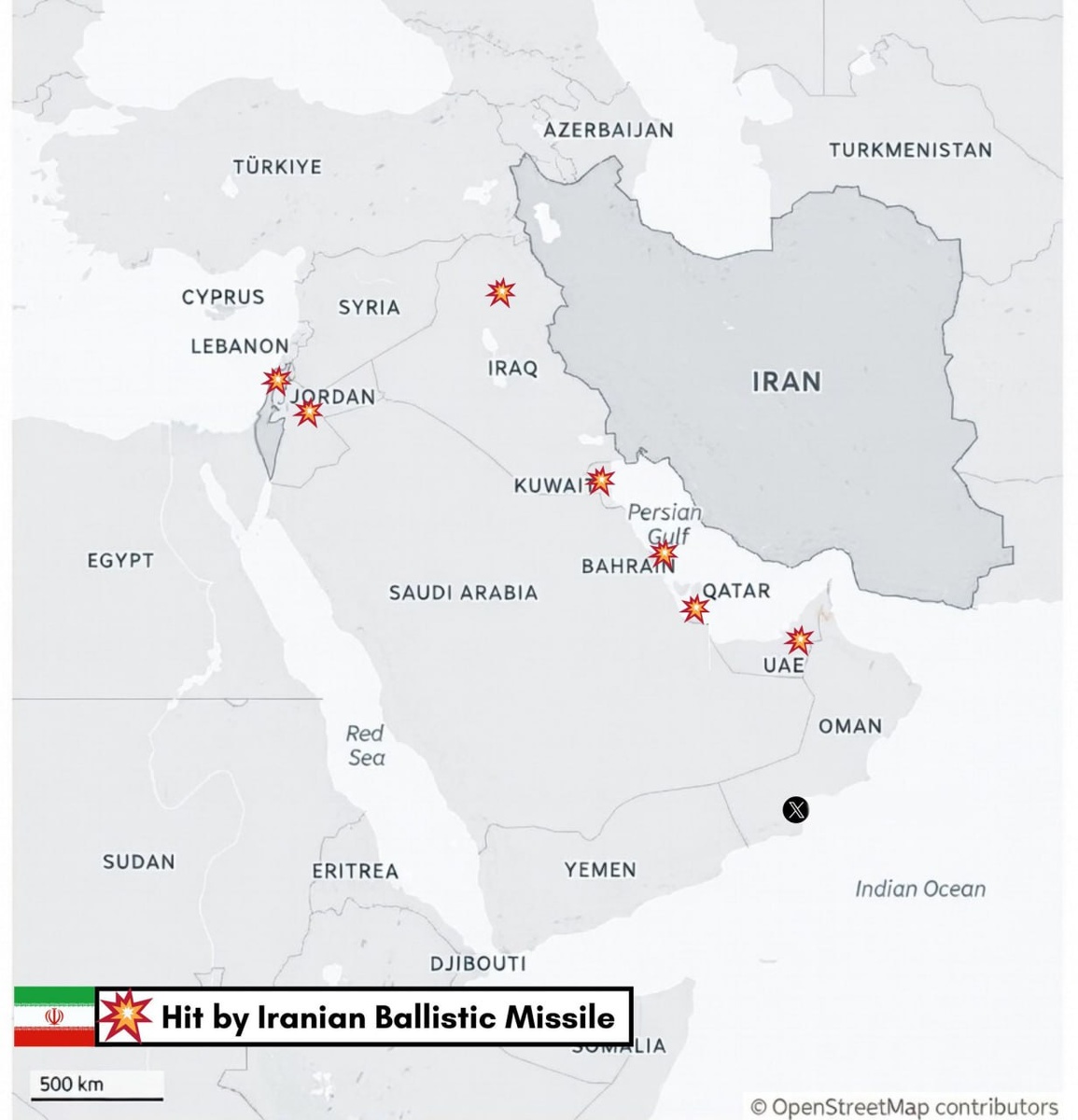 🔥 Карта баз поражённых Иранской баллистикой, которые имеют видео подтверждение на текущий момент.