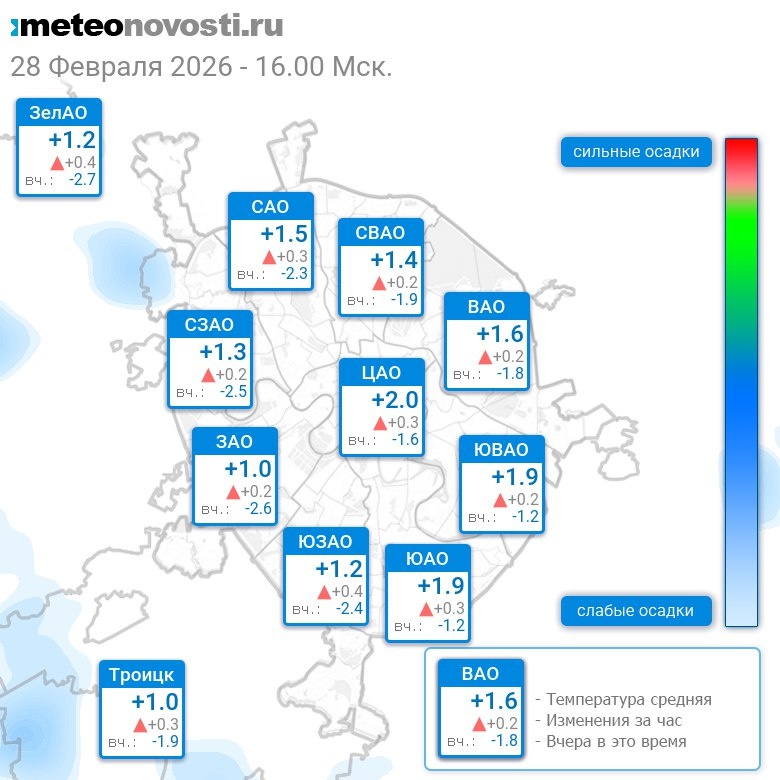 В 16:00 в Москве было от +0.2°C до +2.5°C, средняя температура +1.6°C #погода #Москва #зима #температура #28февраля #суббота