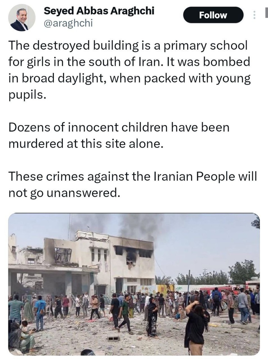 'DOZENS of innocent children MURDERED' by US/Israeli strike on girls' elementary school — Iranian FM Araghchi 'These crimes against Iranian People will NOT go unanswered'