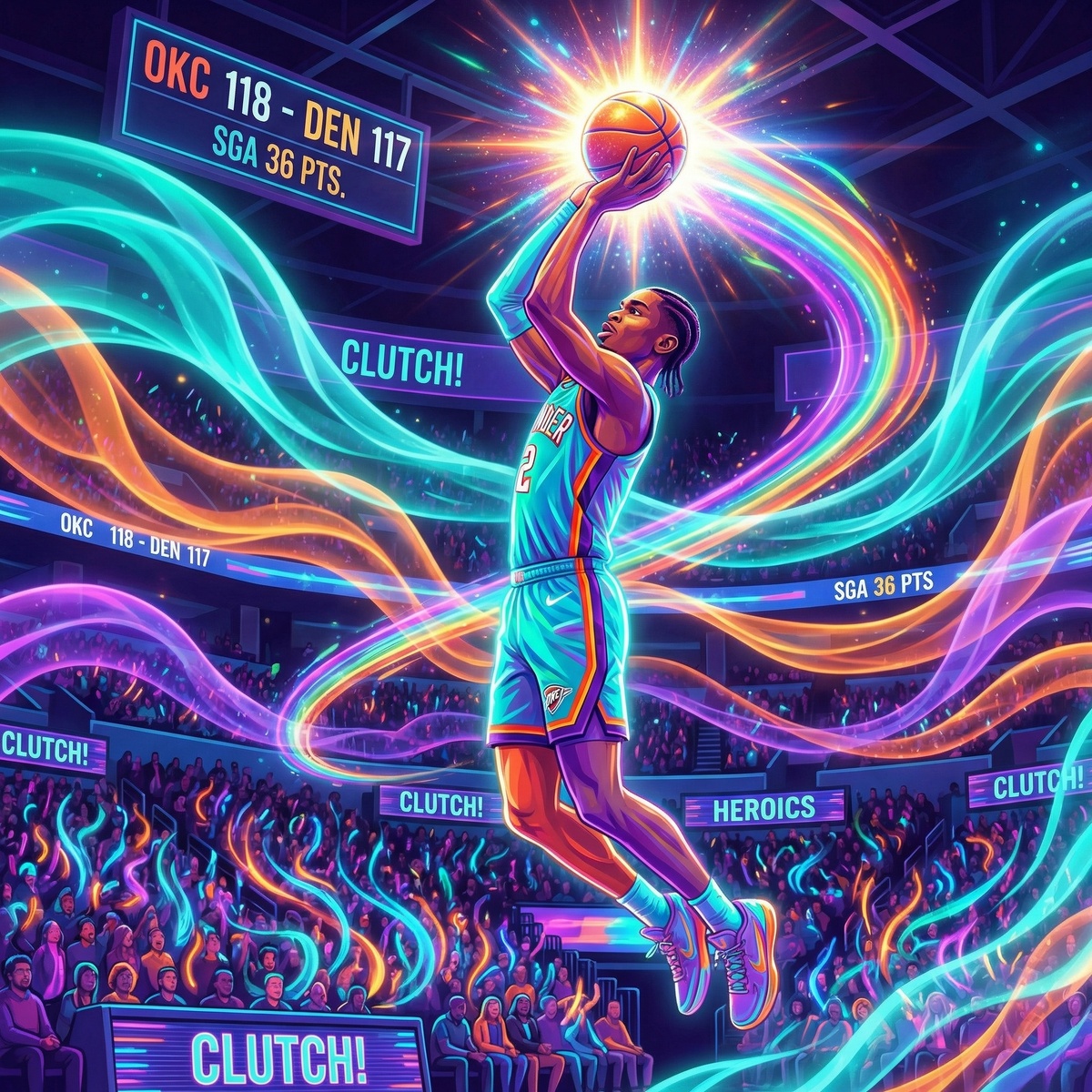 Шай Гилджес-Александер триумфально вернулся после травмы и выдал 36 очков + 9 передач, став главным героем вечера. У Денвера Никола Йокич оформил трипл-дабл (23+17+14), но этого не хватило - 127:121 победа Тандер.