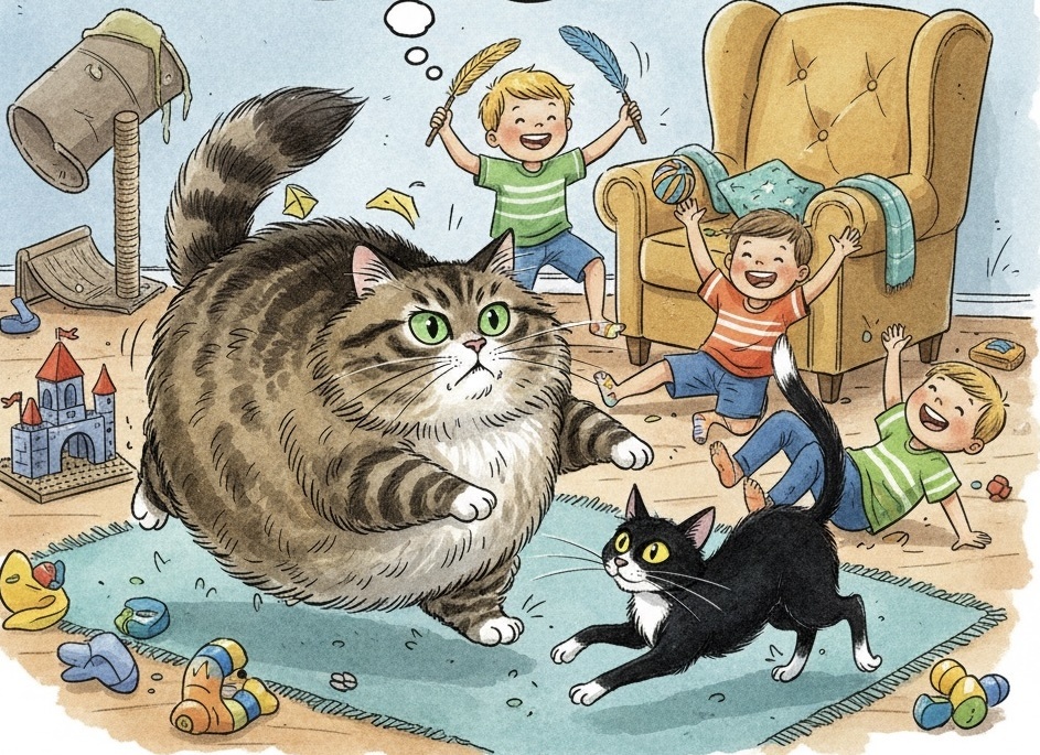 Вы не видели настоящий Формулу-1, пока не наблюдали, как пушистая Шкурка, чей вес визуально удваивается за счет шерсти, на полной скорости утюжит коридор, пытаясь уйти на вираж в детскую, а за ней, как торпеда, врезается Филя. Дети визжат (от восторга), кошки орут (боевые кличи), а я стою с веником и пытаюсь понять, чья сейчас шерсть полетит по квартире — кошачья или моя.