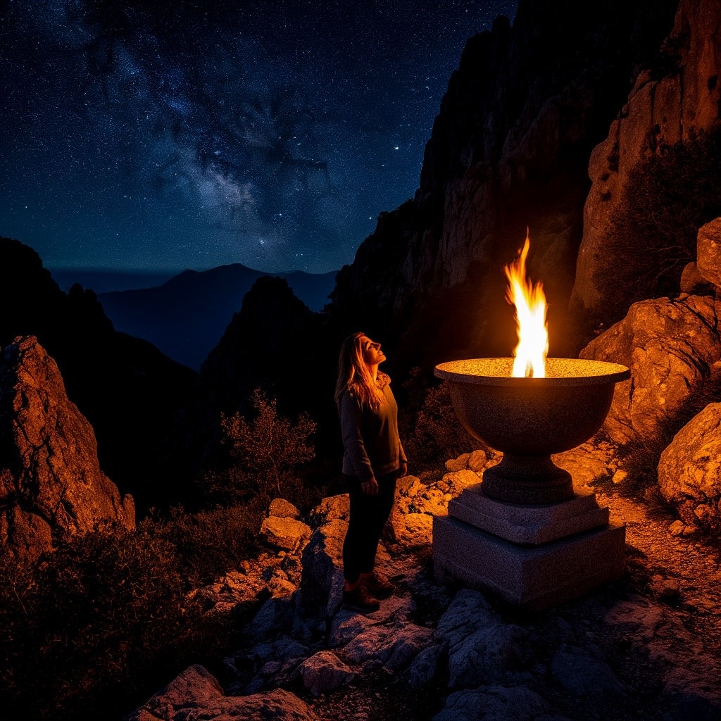 Чем выше я поднимаюсь, тем больше огней. Здесь их десятки — маленькие и большие, горящие в расщелинах, под камнями, прямо на открытых местах. Я иду между ними, протягиваю руки к теплу. В темноте это выглядит сюрреалистично — огни танцуют, тени пляшут на скалах, звёзды светят сверху. Я чувствую себя участницей древнего ритуала.