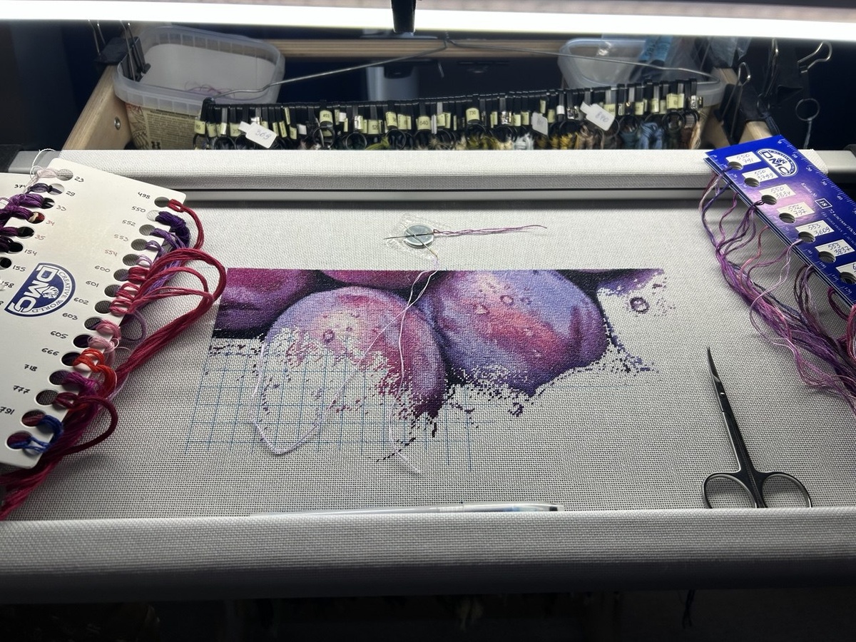 Сегодня последний день февраля, можно подвести итог месяца. Так совпало, что есть еще один повод для поста. 15 000 стежков на Сливах от SiberiaStitch! 24% работы отшито! За 28 дней! Какие цифры! Какой прогресс! Для меня это ощутимый результат. :) В феврале я вышивала только Сливы, да простят меня Горное озеро, Ягодное панно и Календарь плеяд. Я не могу оторваться от процесса. Меня радует все - схема, техника петит/полукрест, а какая палитра! Само удовольствие - вышивать этими цветами. Я не думала, что мне так не хватает фиолетовых и розовых оттенков в моих работах. Не радует меня только моё зрение. Трудно фокусироваться на мелкости. Крестик на 18 и 20 канве даётся намного проще. Отсюда и трудности - я ошибаюсь и не вполне довольна ровностью полотна. "Минное поле" в нижней части центральной сливы пока оставила на потом, вышиваю левую часть дизайна. Сделала разметку, с ней дело идет легче. Но не гарантирует отсутствия ошибок. Смотрю и кажется, что все же есть косяки там, где должны быт