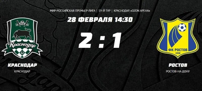 Матч для болельщиков «быков» выдался вполне «валидольным». Сегодня, 28 февраля, на стадионе «Краснодар» для команды кубанской столицы стартовала вторая, весенняя, часть чемпионата России по футболу. Краснодарцы начали матч высоким темпом в итоге заставив ошибиться противника и нарушить правила в собственной штрафной площади ворот. В итоге был назначен пенальти, который успешно реализовал Эдуард Сперцян. В конце первого тайма уже краснодарцы сфолили в своей штрафной площади и получили пенальти. В итоге ростовчане сравняли счет. Точку во встрече на 73-й минуте поставил Никита Кривцов, забивший второй матч в ворота ФК «Ростов». Встреча закончилась победой «Краснодара» со счетом 2:1 и красно-зеленые вновь заняли первую строчку турнирной таблицы российского чемпионата, подвинув питерский «Зенит».