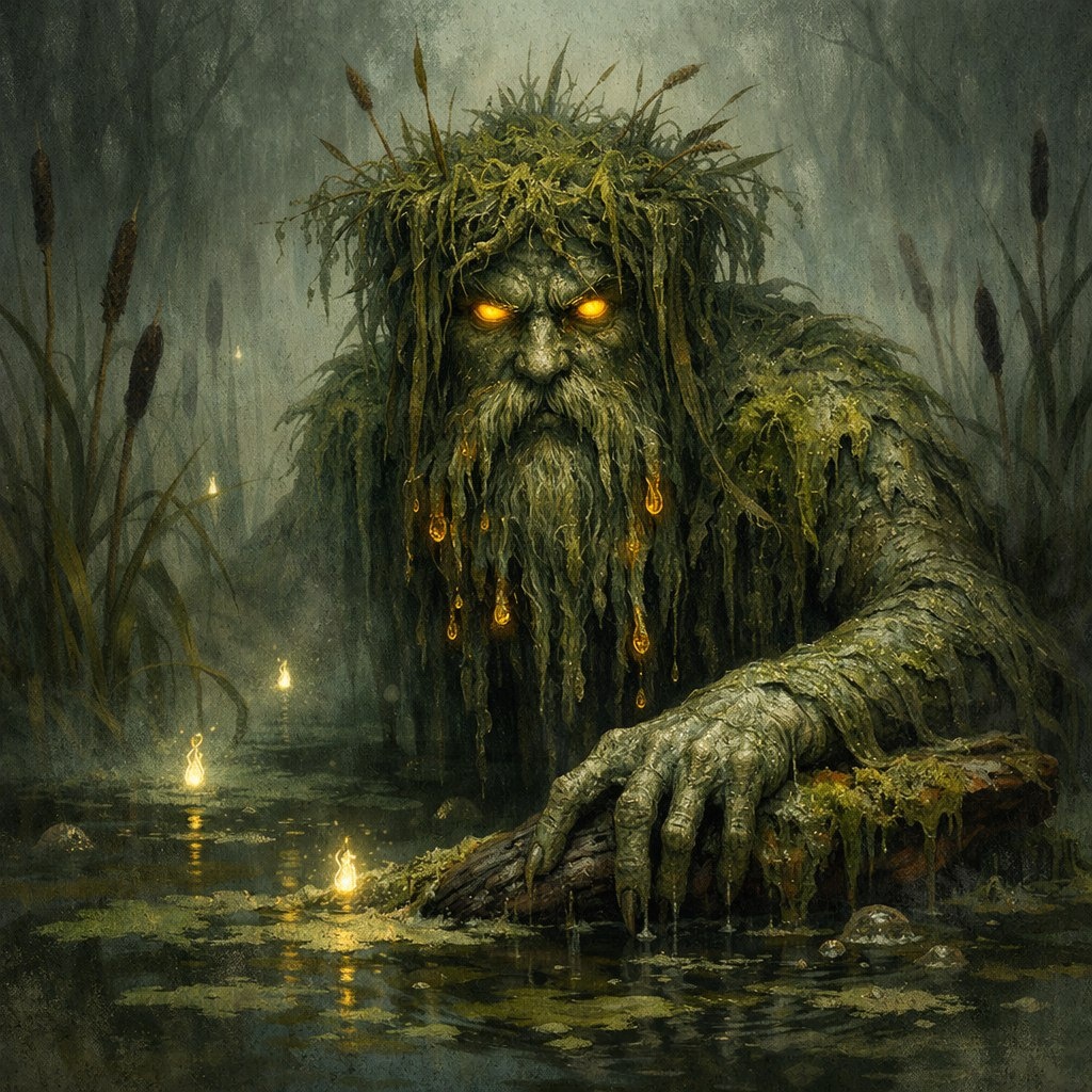 Представь место, где вода едва отличима от земли, воздух густ, как туман, а камыши шепчут сами с собой. Там и живёт Болотник. Его дыхание — запах сырой земли и прелой листвы; его сердце бьётся в ритм пузырей, всплывающих из-под торфа.