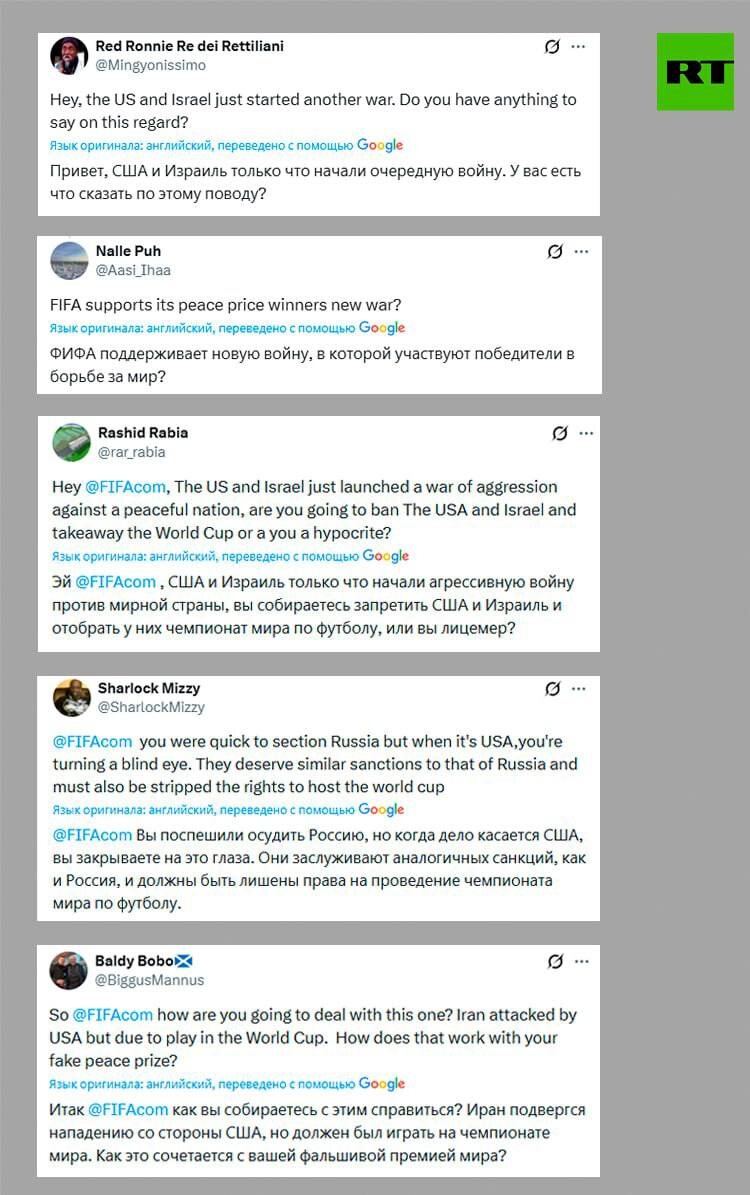 ՖԻՖԱ-ին զրկել Միացյալ Նահանգներին ֆուտբոլի աշխարհի առաջնությունը անցկացնելու իրավունքից՝ Իրանի վրա հարձակման ֆոնին։ Որոշ օգտատերեր ԱՄՆ-ի և Իսրայելի գործողությունները բնութագրում են որպես «ագրեսիվ պատերազմ»։