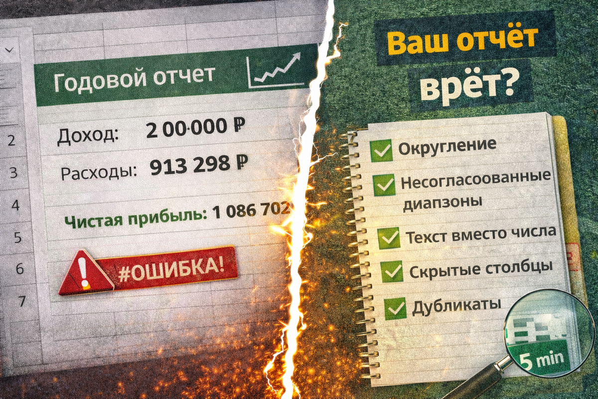 Проверь отчёт в Excel: 7 причин, почему цифры выглядят правильно, но считают неверно. Разбираем скрытые ошибки в Excel-отчётах: округление, объединённые ячейки, несогласованные диапазоны, скрытые столбцы и дубли. Пошаговая диагностика и реальные примеры.