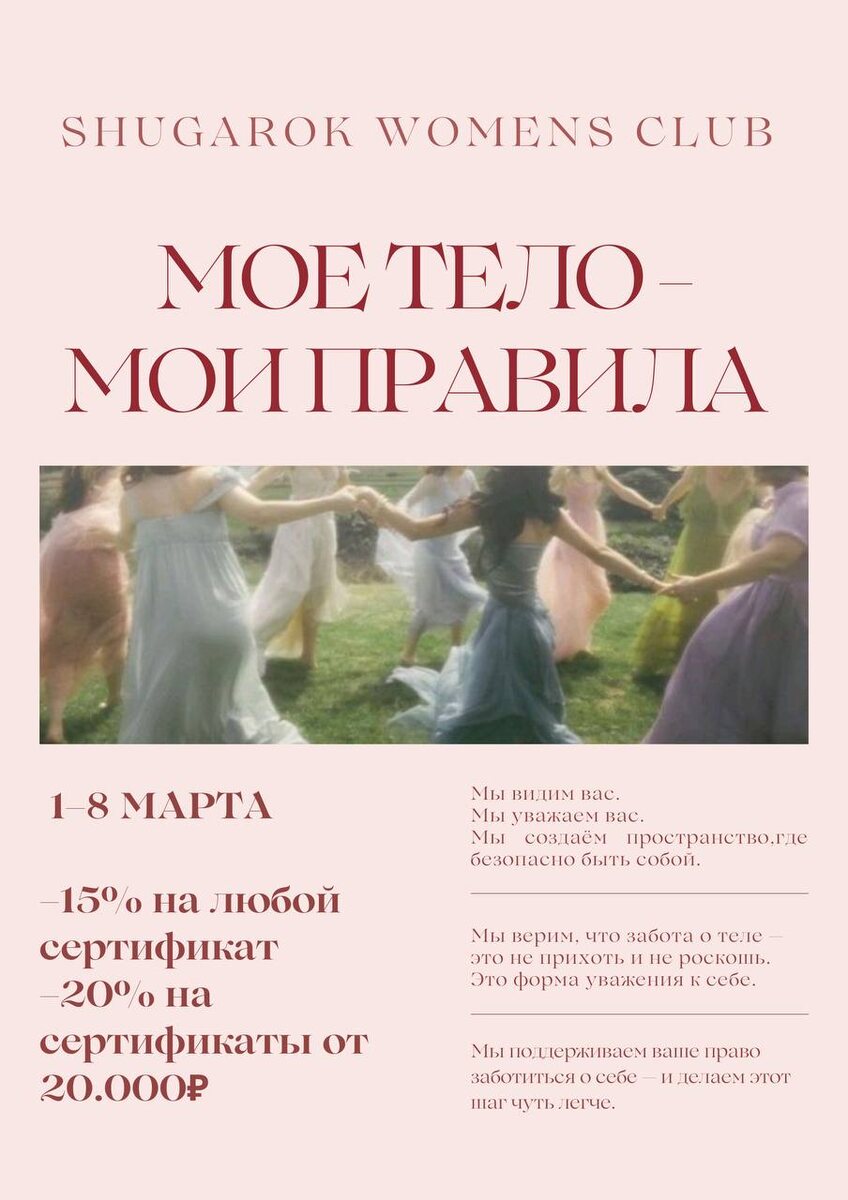 Выбирать, как выглядеть. Выбирать, что чувствовать. Выбирать, кому доверять своё тело. SHUGAROK — это не просто пространство, где делают процедуры. Это территория, где вас не оценивают, не учат жить и не говорят, как «надо». Это место, где ваше тело перестаёт быть объектом обсуждений. Оно становится тем, чем и должно быть — вашей личной территорией. С 1 по 8 марта каждая новая пациентка не просто приходит к нам на процедуру. Она автоматически становится частью закрытого SHUGAROK WOMEN’S CLUB. Что это значит? Вы получаете доступ в сообщество, где: — вас понимают без слов; — уважают ваши личные границы; — дарят не просто скидку, а персональный бонус на следующий визит (мы помним о вас, даже когда вы уходите). Мы видим вас. Настоящих. Разных. Прекрасных. Мы уважаем ваш выбор. И мы создаём пространство, где можно быть собой — без стеснения, без страха, без лишних вопросов. Приходите чувствовать себя теми, кто вы есть. С 1 по 8 марта ждём вас в SHUGAROK, чтобы подарить не просто ухо