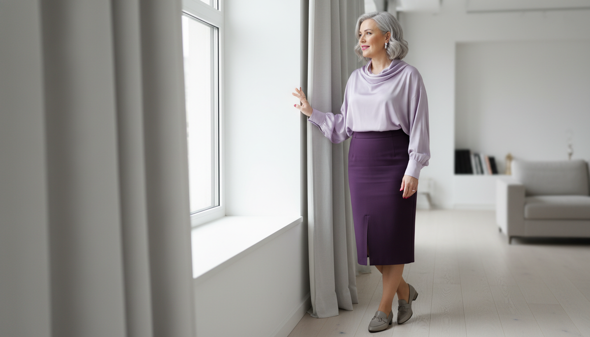 Лавандовая блуза под серым тренчем, сливовая миди снизу - три тона одной холодной гаммы. Тренч набрасывается асимметрично. Снимаете в ресторане: лаванда со сливовым при вечернем свете - уже готовый образ.