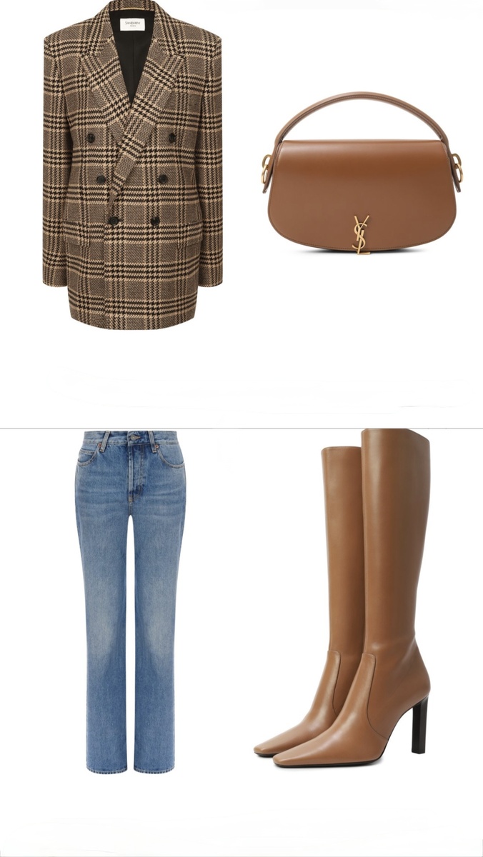 Весна 2026 года обещает быть эпохой смелых экспериментов и изысканной элегантности. В этой подборке представлены пять образов от Ив Сен-Лорана, которые воплощают модные тенденции сезона и классическое видение стиля. Надеюсь, они вдохновят вас на создание своего неповторимого образа. Перед нами яркий пример фирменного стиля Saint Laurent, где классика и современность гармонично сочетаются. Центральным элементом образа выступает объёмный двубортный пиджак, который напоминает мужские модели, но благодаря особой интерпретации приобретает женственность и элегантность.Классические синие джинсы разбавляют строгость пиджака, придавая образу лёгкость и актуальность. Прямой крой, который стал настоящим хитом сезона, подчёркивает фигуру и универсален в носке.Коричневые кожаные сапоги до колена — это практичное и стильное решение.Завершающим штрихом выступает компактная коричневая кожаная сумка. Он подойдёт как для деловых мероприятий, так и для прогулок по городу. Этот образ лаконичен, но выраз