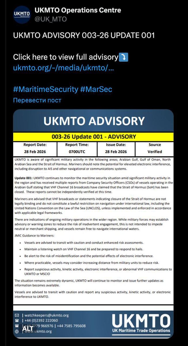 Британское агентство морских торговых операций получает многочисленные сообщения о закрытии Ормузского пролива от капитанов кораблей