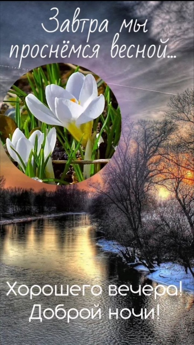 ! Надежда Мелехова А завтра весна -представляешь! Уйдут снега и метели. И птицы запели трели Под звон весенней капели. А завтра весна - снова чудо! Подснежник пробьётся к свету И будет греть снова солнце, Сквозь радугу рассвета. А завтра весна постучится, Откроешь ей окна и двери. Восьмое Марта настанет для женщин В цветной цветочной акварели. А завтра весна придёт в гости, Чтоб увести снова в лето И будут речка и поле, Ромашки и наше лавстори. А завтра весна - представляешь! Уйдут снега и метели, И птицы запели трели Под звон весенней капели. Друзья, всем доброй, мирной ночи. До завтра.❤️❤️❤️❤️