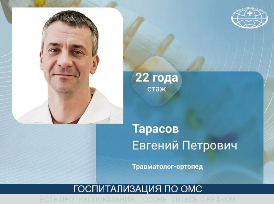 👨⚕️ 13 марта в Петрозаводске пациентов принимает: Тарасов Евгений Петрович ▪️ Врач травматолог-ортопед, стаж - 22 года ▪️ Специализация - эндопротезирование коленного и тазобедренного суставов ▪️ Заведующий отделением травматологии и ортопедии АО «Медицина» 📍 Приём состоится по адресу: Карелия, г. Петрозаводск, ГБУЗ РК «Городская поликлиника №1», Лесной проспект, д. 40 ✉️ Для записи необходимо отправить сообщение: 📞 +7 999 924 22 55 📧 skakovskiy.k@medicina.ru В сообщении укажите: ФИО, дату рождения, код диагноза по МКБ, медучреждение прикрепления и готовность приехать на госпитализацию в АО «Медицина».
