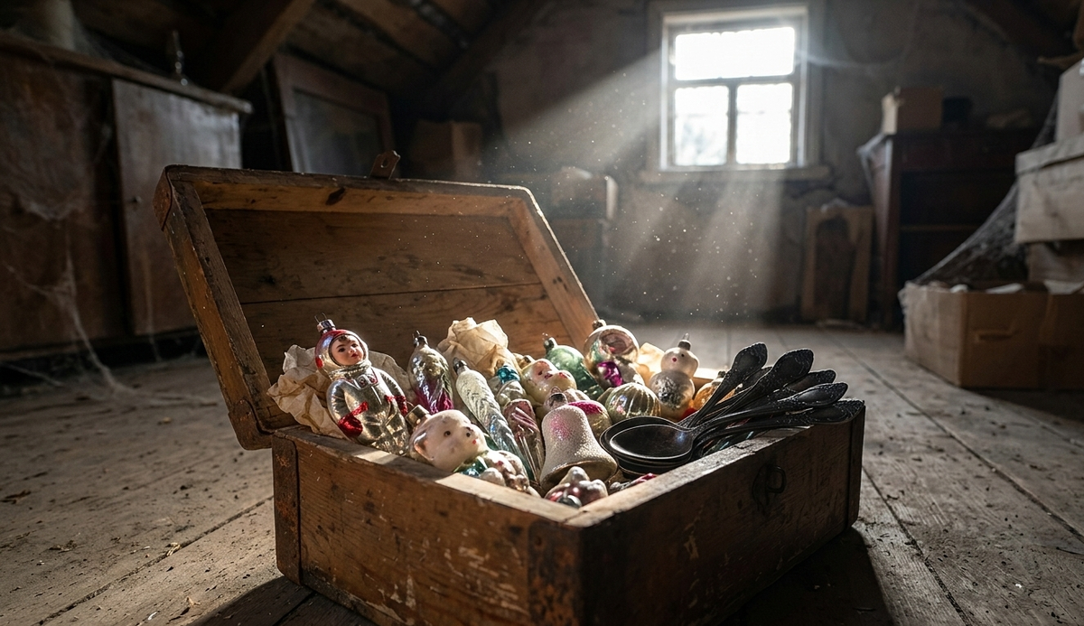 Нашел на чердаке коробку, которую не открывали лет сорок. Стеклянные игрушки на прищепках, тяжелые мельхиоровые ложки и запах того самого детства, которое уже не вернуть. Почему эти вещи стоят дороже любого современного пластика?