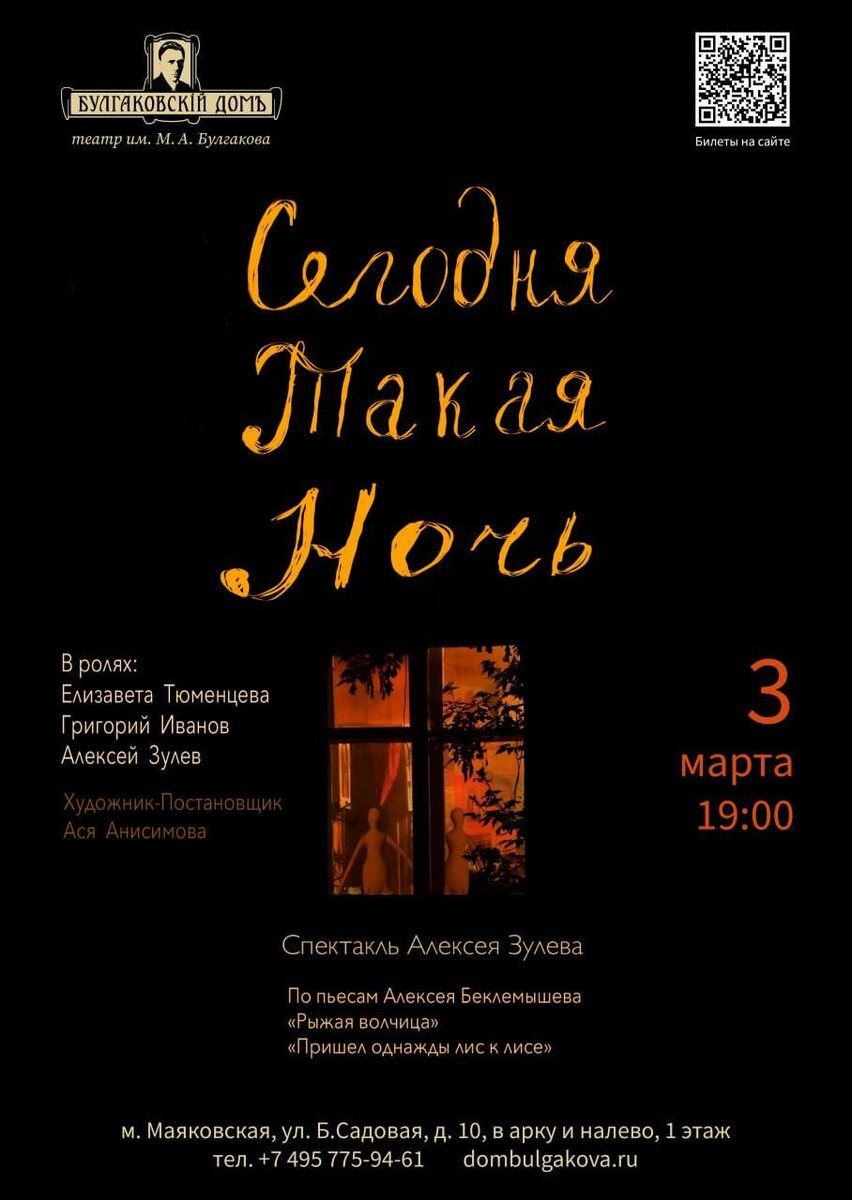 В музее-театре "Булгаковский дом" с 2004 года работает прекрасный экскурсовод Алексей Белемышев. Алексей также актер, режиссер, писатель, драматург и член Союза Писателей! Недавно у Алексея вышла книга Москва в кино. Путешествие по местам съемок любимых фильмов. От "Москва слезам не верит" до "Брат 2". В этот день, 3 марта, в театре им. Булгакова пройдет спектакль «Сегодня такая ночь». Пьесы, которые легли в основу спектакля: «Рыжая волчица» и «Пришел однажды лис к лисе», написал Алексей Белемышев. ✨ Спектакль состоит из двух историй: о любви, добре и зле, о мечтах и снах, о диалоге человека с чем-то большим, чем является он сам. Две истории о несбывшемся, но желанном, о забытом, но перевернувшем жизнь, о чудесном, но вдруг ставшим возможным. 🧡 Приходите в музей «Булгаковский дом» знакомиться с современными писателями лично! Ждем вас на спектакле 3 марта 👀 🎫 Билеты: clck.ru/3Rhsif Дата и время: 3 марта, 19:00 Продолжительность: 1 час 30 минут без антракта 📍Место: музей-театр «