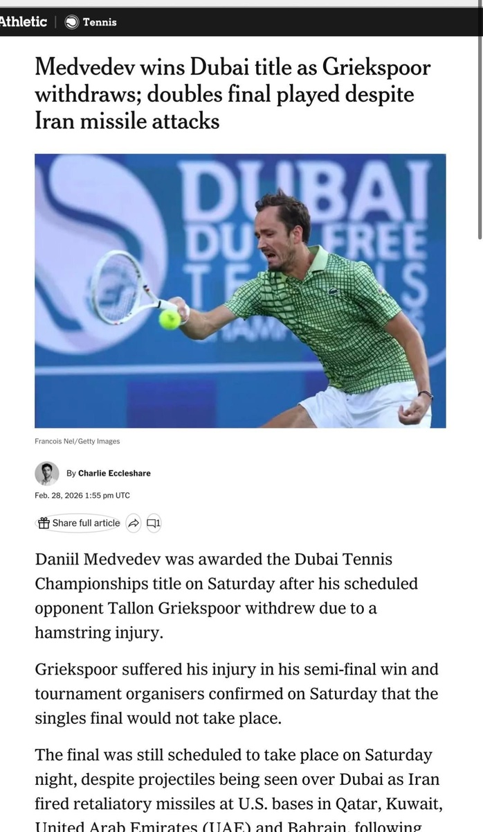 Представитель Медведева сообщил, что они пытаются вывезти игрока из Дубая, так как на следующей неделе в Индиан-Уэллсе стартует BNP Paribas Open. Матч парного разряда состоялся, несмотря на иранские ракетные удары. Подпишись на Эйс и точка
