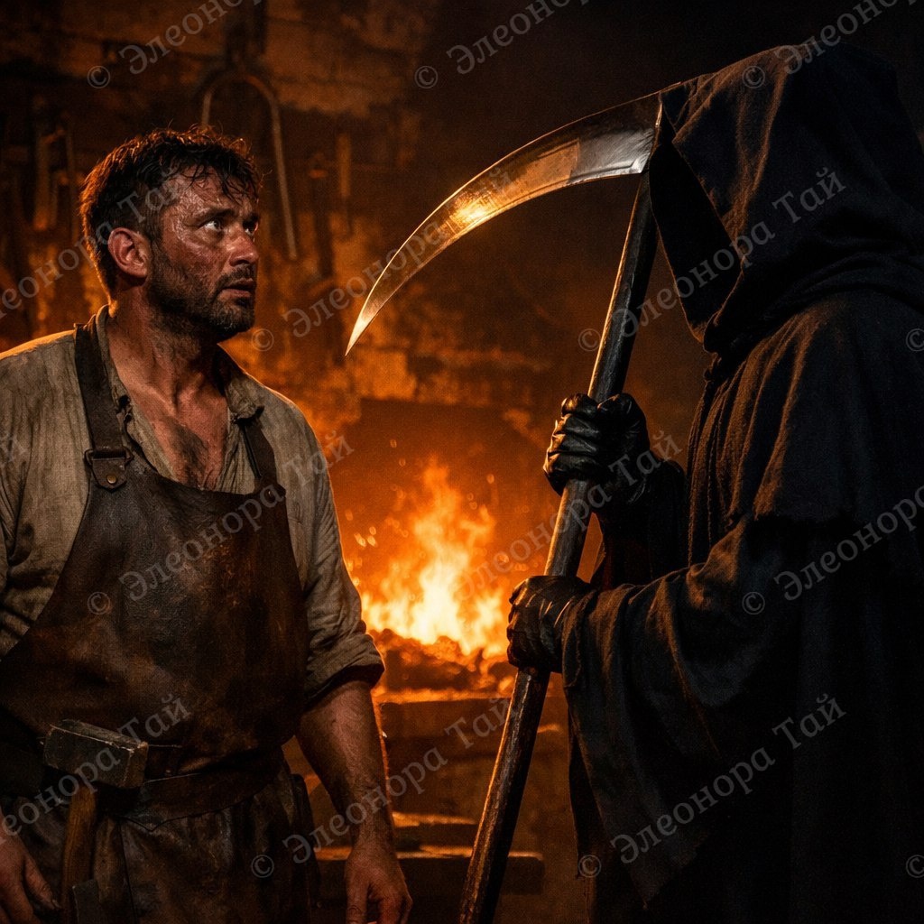 – сопение… Василий удивлённо обернулся и увидел кого-то в чёрной накидке до пят с капюшоном, закрывавшим лицо. В руках незнакомца была коса. — Как вы вошли? – недовольно поинтересовался Василий, — и что вам надо? — Если можно, наточите мою косу и выпрямите её… – ответил только на второй вопрос незнакомец хрипловатым женским голосом. Василий поёжился: — Вы – женщина, что ли? — Ну, как, наточите? – уклонился от ответа незнакомец. И тут… Василия осенило, он даже похолодел от догадки и обессилено опустился на стульчак: — Вы – смерть? Гостья кивнула головой. — За мною? — Нет! Пока нет… Мне косу наточить надо… И выпрямить… Поможете? — Да-да, конечно! О чём речь!? – Василий придвинул к госте стул, — чай, кофе? — Спасибо, я только недавно утолила жажду… – гостья удобно расселась на стуле и закинула ногу на ногу. Василий стал рассматривать косу… Древко из ценной породы дерева, отполированное до блеска, лезвие согнуто, со множеством зазубрин и с клеймом «Made in…», где именно изготовлено бы