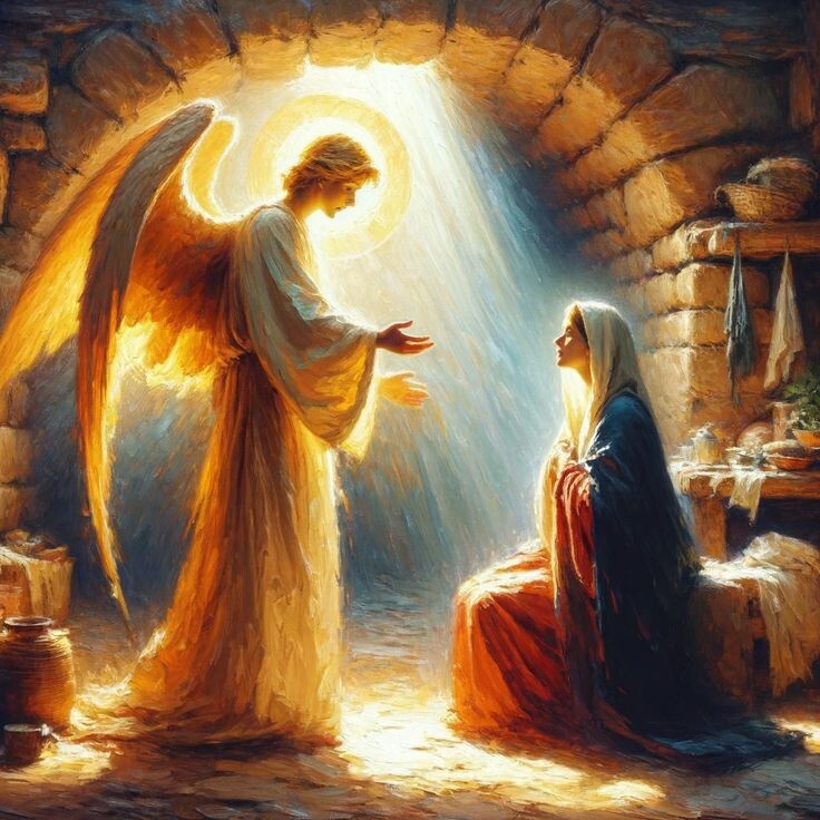 Мария удивилась: «Как же это может быть? У меня ведь нет мужа». Ангел ответил: «Для Бога нет ничего невозможного. Святой Дух сойдет на тебя, и родится Сын Божий».