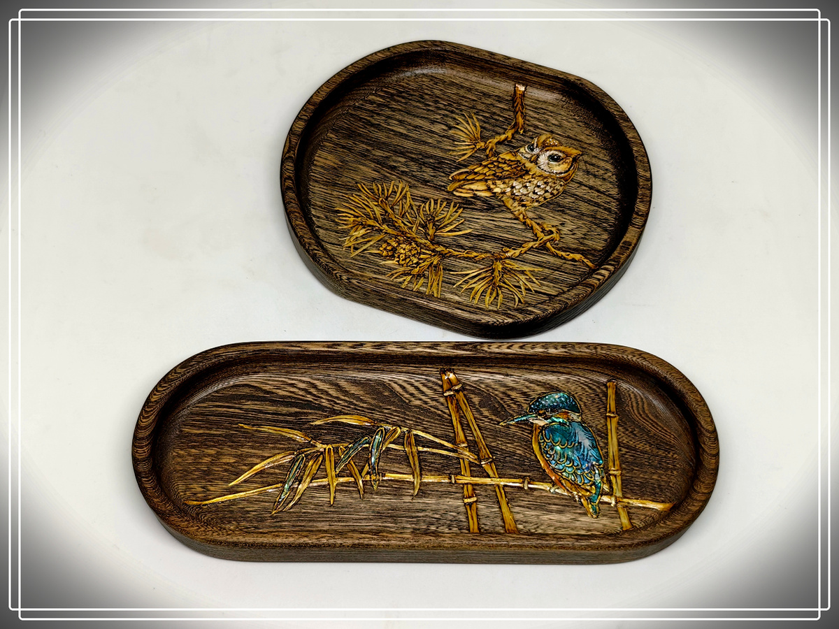 Некоторое время назад на одной из выставок - если говорить совсем уж точно, на "Керамании" - я познакомилась с мастером, делающим деревянные игрушки. Кроме них он взял с собой еще несколько небольших деревянных подносов, выточенных из вяза. Вещицы эти были сделаны настолько хорошо, что я выкупила их, а чуть позже даже договорилась с мастером о сотрудничестве Глядя на маленькие подносы я представила себе ботанические иллюстрации, которыми когда-то украшали старинные книги художники. Так появился необычный проект "Ботанические иллюстрации", только вместо рисунков была мозаика из соломки и перламутра В этот же раз захотелось расширить тематику, и украсить несколько подносов иначе Когда я начала рассказ об этих небольших изделиях в прошлый раз, некоторые читатели даже подумали, что работа над ними окончена. Но до окончания было еще далеко. Соломка, которую я использую в своих работах, имеет разную толщину. Поэтому после того, как весь рисунок выложен, я тщательно его разглаживаю. Делаю эт