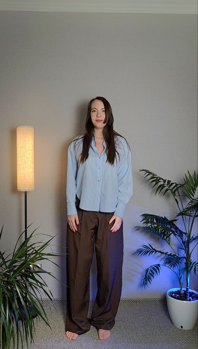 Взяла в качестве основы рубашку в полоску и коричневые брюки палаццо и составила с этими вещами 4 совершенно разных образа. Смотрите на фото!