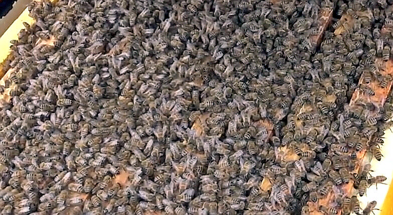 - рамки с мёдом ставят плашмя над клубом пчёл (заполненные на ⅓–½, не полномедные — иначе пчёлы начнут переносить корм, что их возбудит);