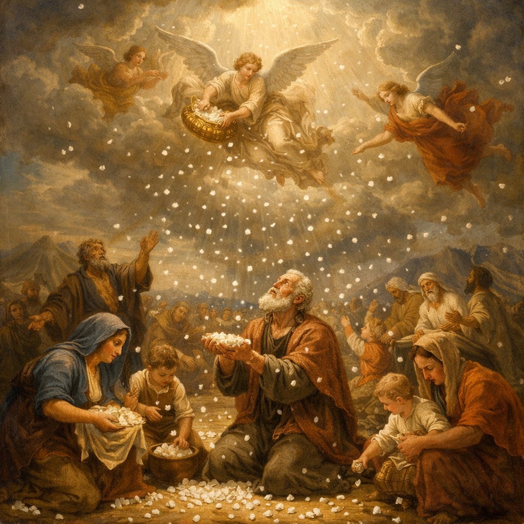 В пустыне народ сталкивается с новой проблемой: нет еды. Они снова вспоминают Египет как место “котлов с мясом” и забывают о кнуте. Бог даёт манну и перепёлок — но при этом устанавливает важный урок: хлеб — на сегодня, а не “на всю жизнь вперёд”.