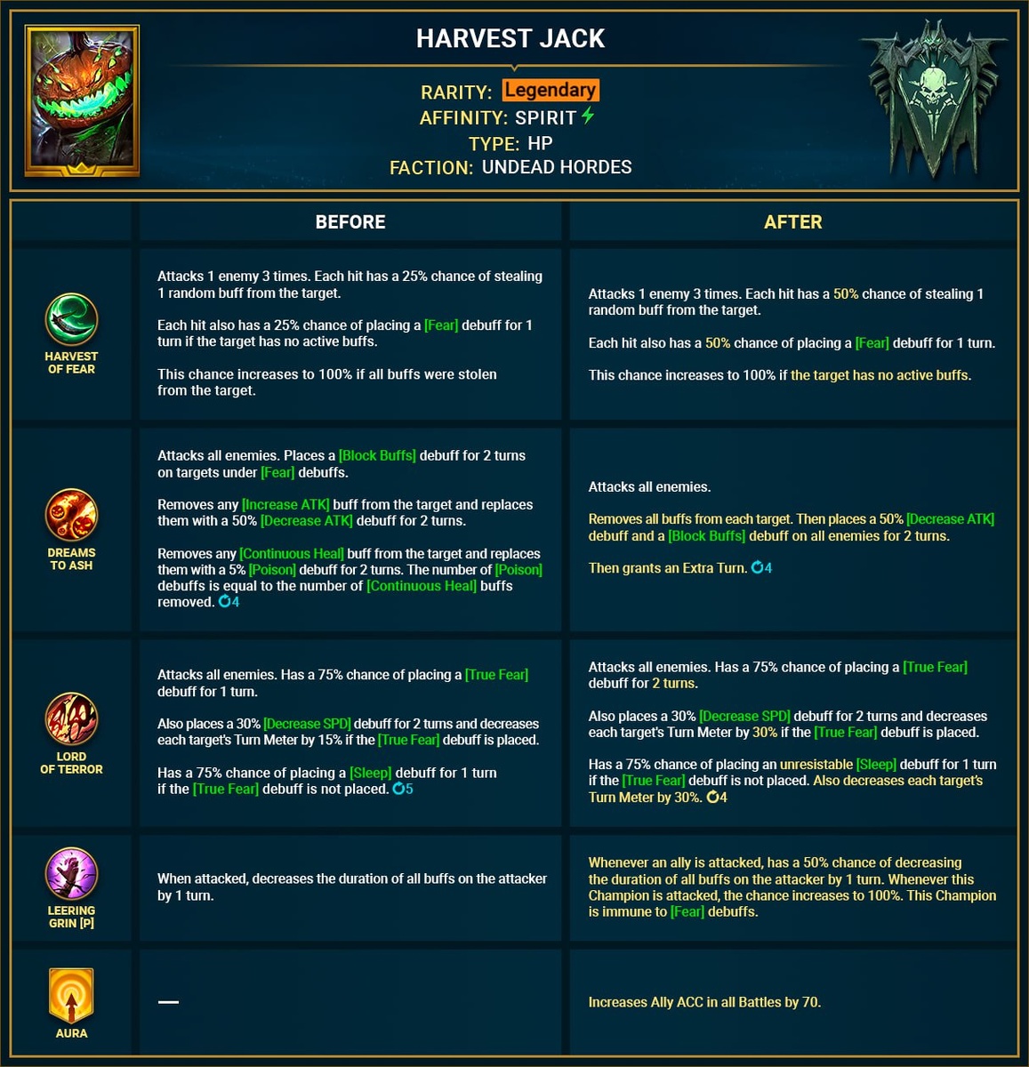 Жнивец А1 - Жатва страха Атакует врага 3 раза. Каждый удар с вероятностью 50% крадет у цели 1 случайный бонус. Каждый удар также с вероятностью 50% накладывает Страх на 1 ход. Если у цели нет активных бонусов, эта вероятность возрастает до 100%. А2 - Мечты из пепла Атака по всем врагам. Снимает все бонусы с каждой цели. Затем накладывает на всех врагов Штраф атаки 50% и Блок бонусов на 2 хода. Ходит еще раз. А3 - Владыка ужаса Атака по всем врагам. С вероятностью 75% накладывает Истинный страх на 2 хода. Если удалось наложить Истинный страх, также накладывает Штраф скорости 30% на 2 хода и сокращает шкалу скорости каждой цели на 30%. Если не удалось наложить Истинный страх, с вероятностью 75% накладывает Сон, который невозможно отразить, на 1 ход. Также сокращает шкалы хода целей на 30%. Зловещий оскал (пасс.) Когда союзник получает удар, с вероятностью 50% сокращает действие всех бонусов атакующего врага на 1 ход. Когда этот герой получает удар, вероятность возрастает до 100%. Имм