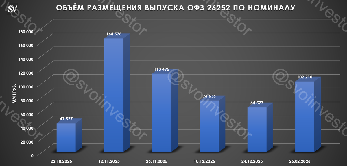 Минфин провёл аукцион ОФЗ, предложив инвесторам два выпуска. При его проведении индекс RGBI находился выше 118 пунктов, с учётом недельных принтов инфляции и переговорного трека индекс снизился до 118,10 пунктов: 🔔 По данным Росстата, за период с 17 по 24 февраля ИПЦ составил 0,19% (прошлые недели — 0,12%, 0,13%), с начала месяца 0,51%, с начала года — 2,14% (годовая — 5,8%). Недельные темпы февраля подскочили из-за праздников (прошлогодние недельки: 2025 г. — 0,23%, 2024 г. — 0,13%), при этом расчёт идёт за 8 дней и прошлогодние темпы выше. Нам же остаётся дождаться подсчёта 4 дней февраля и месячного пересчёта (который преподносит сюрпризы), учитывая сегодняшние темы это примерно 0,6% за месяц, что гораздо ниже прошлогодних данных (0,81%). 🔔 В 2026 г. Минфин планирует разместить в ОФЗ 6,5₽ трлн (в иностранной валюте в объёме, эквивалентном не более 1$ млрд, проинфляционный фактор). Такая сумма выглядит довольно оптимистично на фоне курса $ и цены Urals (в 2025 г. разместили более 8