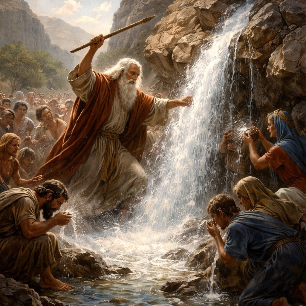 Путь по пустыне продолжается, и снова — жажда, отсутствие воды. Опять ропот, снова требования “дай нам воды”, даже угроза побить Моисея камнями. Бог даёт воду из скалы — и этот образ станет ключевым в христианском понимании.