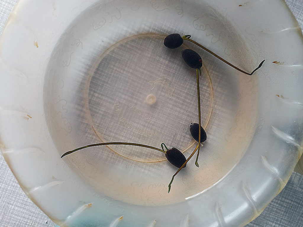 Если честно, я не собиралась выращивать лотос. Это был один из тех моментов, когда давно смотришь на семена, читаешь, как вырастить лотос, прикидываешь, куда его поставить, и откладываешь на потом. А потом вдруг что-то щёлкает, и ты уже кидаешь семена в воду. Без какой-либо стратегии и плана, а через несколько дней видишь длинные зелёные ростки. В этот момент становится понятно, что самое простое в истории с лотосом это прорастить его. Всё интересное начинается потом. Семена я подпилила и замочила в тёплой воде. Воду меняла каждый день. Через несколько дней появился длинный семядольный лист. На этой стадии росток может какое-то время жить просто в воде, но затягивать не стоит – корешок быстро начинает искать питание. И тут многие делают ошибку. Берут обычный лёгкий грунт для рассады - лотос такого не любит. Торфяные смеси всплывают, вода мутнеет, начинается закисание. А лотосу нужна тяжёлая, плотная среда, почти как природный ил. Я остановилась на такой пропорции. Две части глины, одна