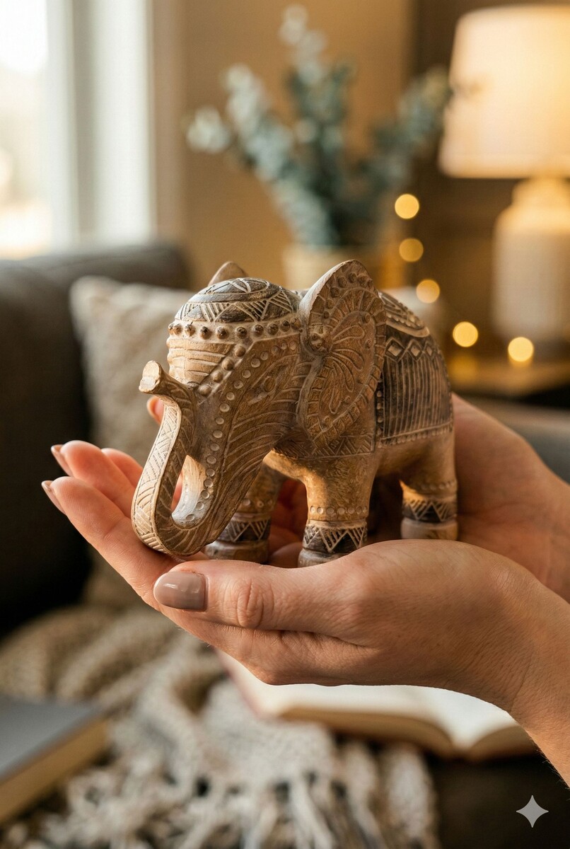Это небольшая интерьерная фигурка слона в золотом цвете — тот самый декоративный акцент, который «собирает» полку/консоль и делает композицию дороже на вид. Слон выполнен из полистоуна (приятный «тёплый» материал, не выглядит как дешёвый пластик), а поверхность украшена резьбой/узором под африканские орнаменты — за счёт этого фигурка хорошо ловит свет и выглядит фактурно даже в простом интерьере. Размер удачный: не микросувенир, но и не громоздкая статуэтка — примерно 15×14 см. Его удобно ставить на тумбу в прихожей, на журнальный стол, на комод, рядом со свечами или книгами. Итог: если нужен небольшой, но заметный интерьерный акцент с ощущением «журнального декора», этот слон — отличный кандидат: фактура + золото = сразу дороже картинка и композиция.