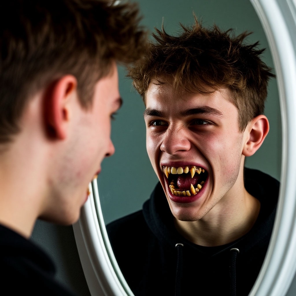 Губы в зеркале растягивались в широкой, неестественной улыбке, обнажая слишком много зубов. А глаза… глаза были не его. Они были фиолетовыми, с вертикальными зрачками.