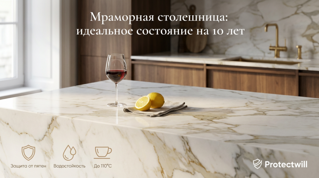 - Термостойкость 120°C. Обычные пленки «плывут» при 80°C. Protectwill выдерживает горячую чашку кофе или тарелку супа без следов. (Важно: раскаленную скороду 200°C+ всё же лучше ставить на подставку, как и на любой камень).